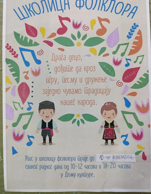Упис у школицу фолклора (1. и 2.разред) је у току и трајаће до 10.11.2025. године у терминима од 10.00-12.00 часова пре подне и 18.00-20.00 часова поподне.